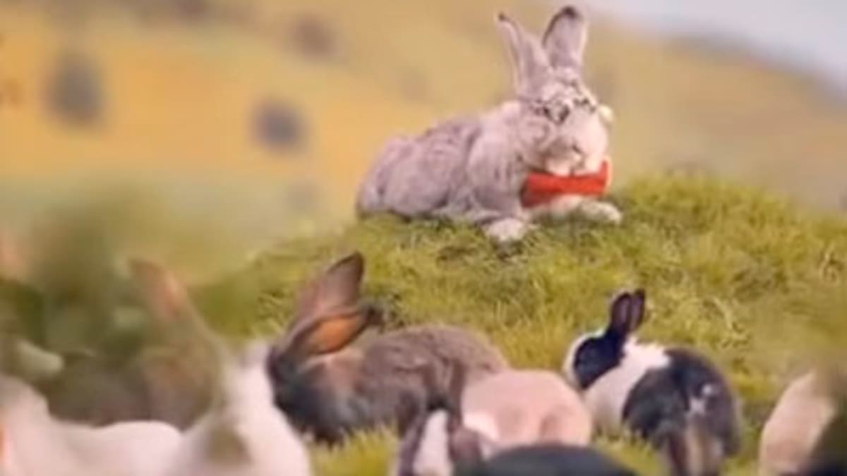 En el vídeo se ven varios conejos en un prado. Unos brincan, comen zanahorias o col. Otro, que lleva gafas de sol y está acostado en la hierba, bosteza.