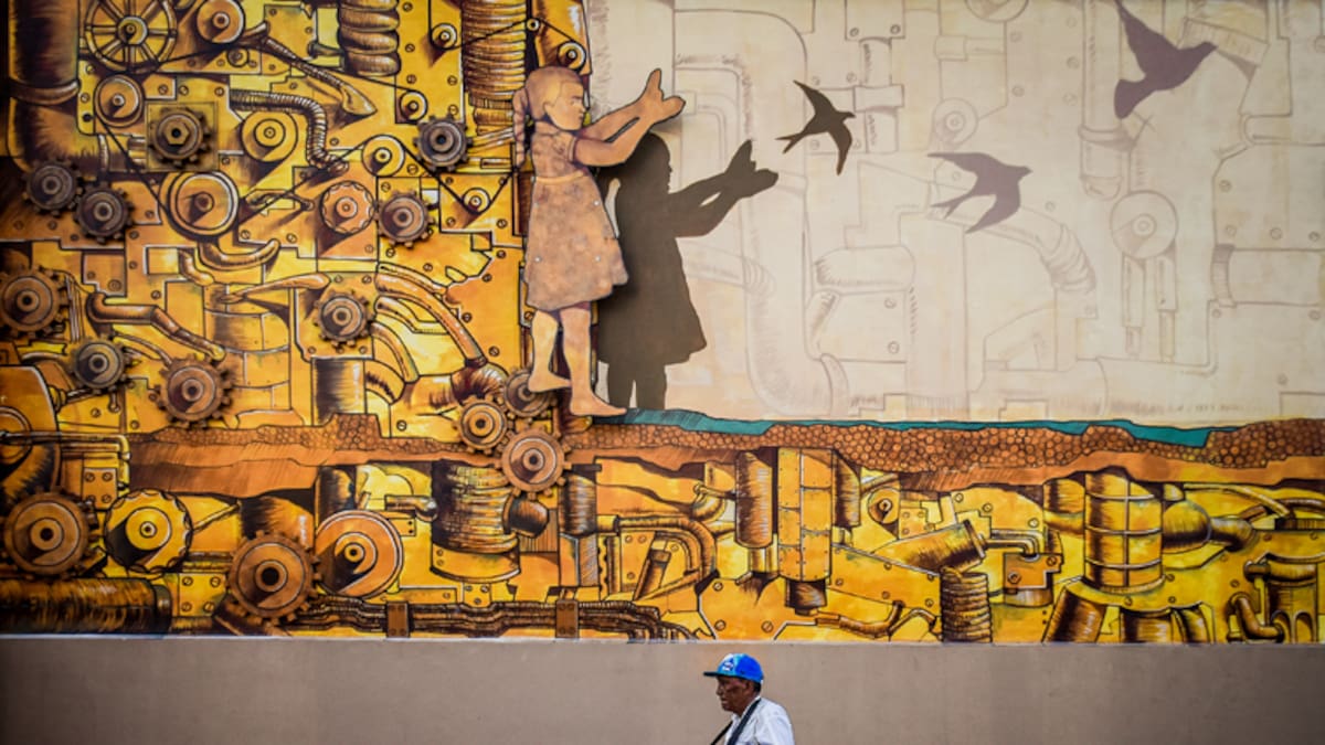 El trabajo, que contó con el apoyo del escultor Eduardo Araújo, tiene figuras en alto relieve como los engranajes de las maquinas del mural que están hechas de elementos reutilizados.
