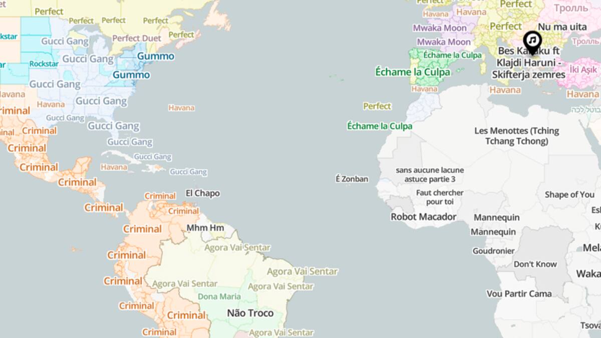 El sitio The Pudding publicó el proyecto 'The Cultural Borders of Songs', un mapamundi interactivo que muestra cuáles fueron las canciones más escuchadas del mes pasado en más de tres mil ciudades alrededor del globo terráqueo, según sus vistas en Youtube y reproducciones en plataformas de streaming. También tiene un buscador para encontrar más rápido las ciudades.