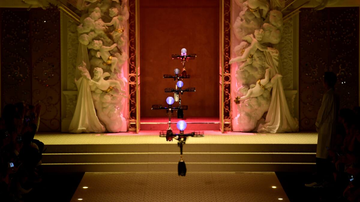 El espectáculo comenzó con un sorprendente ballet de una docena de drones que sobrevolaron la pasarela para presentar la nueva colección de bolsos de la marca.