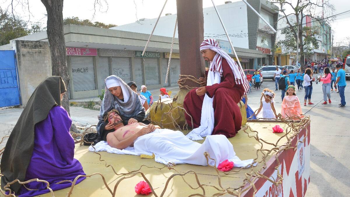 Detrás y delante de él, más carrozas y actores naturales representaban otros pasajes bíblicos como la Pasión de Cristo, la segunda venida de Jesús, del Apocalipsis; o el jardín del Edén, del Génesis.