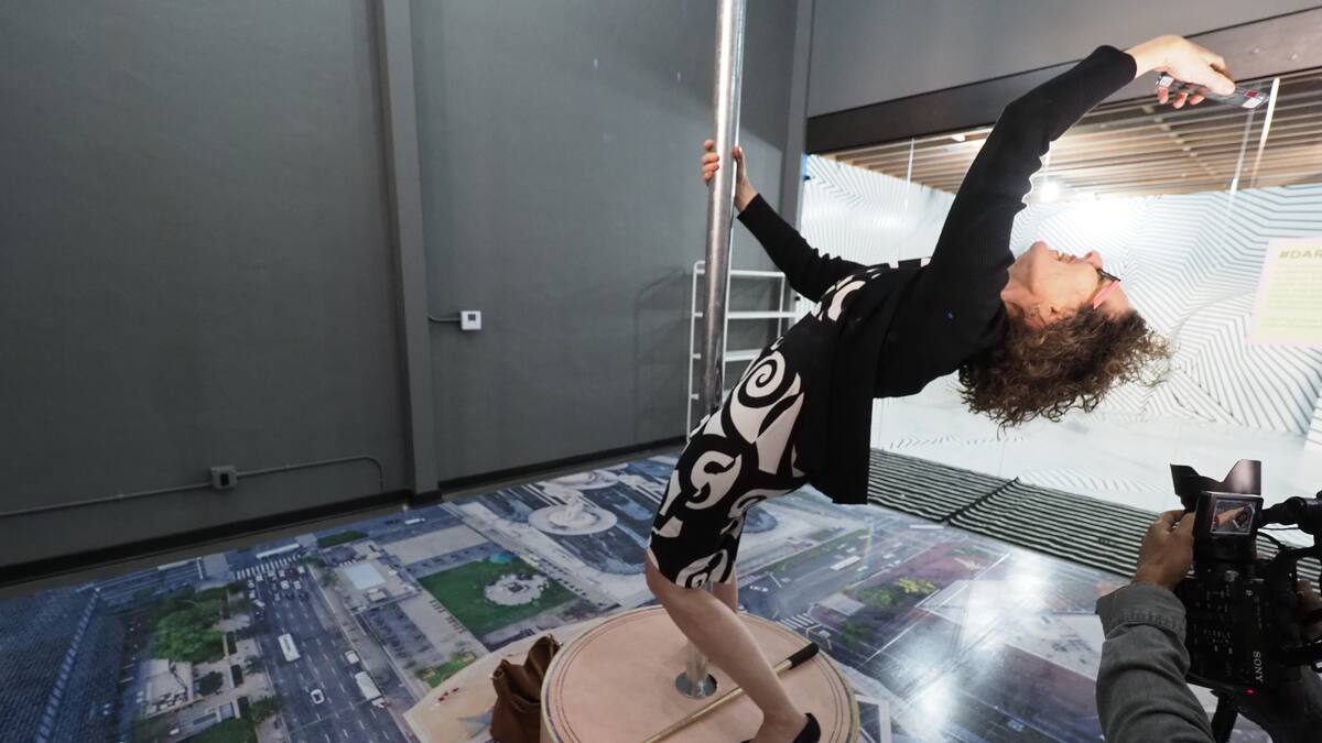 Una de ellas en una instalación que simula la azotea del edificio más alto de Los Ángeles: una foto pegada al suelo con una pequeña plataforma de la que sale un tubo que asemeja a la antena de la estructura. Tiene inclusive un bombillo rojo, que imita a la baliza de señalización.
