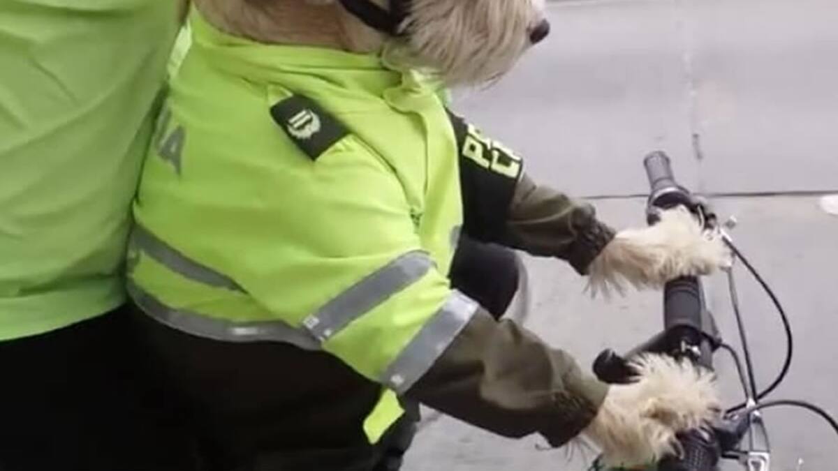 Nicolás Alejandro Walteros patrullero del CAI de Fontanar de Suba, dio a conocer como su perro ‘Coronel’ permanece inmóvil, con un equilibrio asombroso sobre la bicicleta. ‘El can había sido abandonado y rescatado por el patrullero, que lo acogió en su casa y además lo entrenó para que le ayudara en su tarea como policía. Fue así como Walteros le enseñó a “andar en moto y bicicleta”..