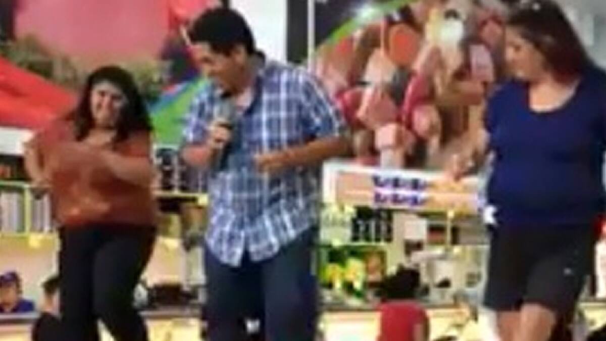 En medio de una competencia de baile, el animador propuso escoger a dos mujeres del público para que bailaran al ritmo de la canción que el cantaría con el fin de ganarse un gran premio.