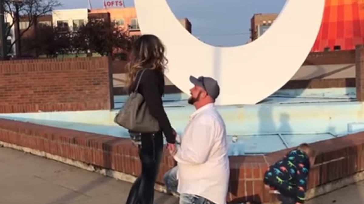 En video quedo grabado el emotivo momento en que Allyssa Anter se dispuso a dar el 'sí' a su novio Kevin Przytula, el pasado sábado 12 de mayo, frente a la escultura Ring of Friendship de Bay City, Estados Unidos. Sin embargo, una sorpresiva intervención hecha por el hijo de la mujer agregó un toque único a la propuesta.