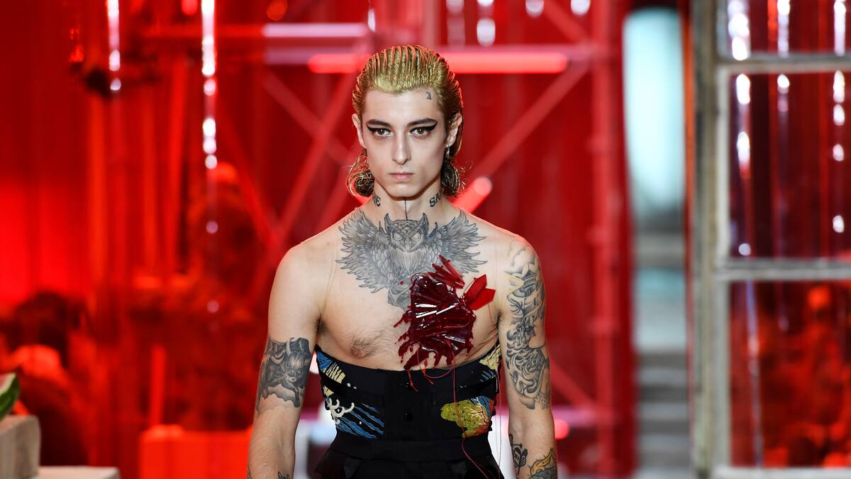 Mientras Madeleine Vionnet y Paul Poiret fueron los primeros diseñadores en liberar a la mujer del corsé, el creador británico lo adaptó en su nueva colección para el vestuario masculino: se lleva como un cinturón color carne sobre una chaqueta de traje oscuro, o bien con un estampado de leopardo sobre un pantalón rosa de vinilo.