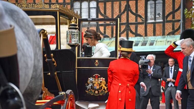 Sin velo en un día de muy fuerte viento, la princesa llegó tocada con una tiara ornada con una gran esmeralda que le prestó la reina Isabel II.