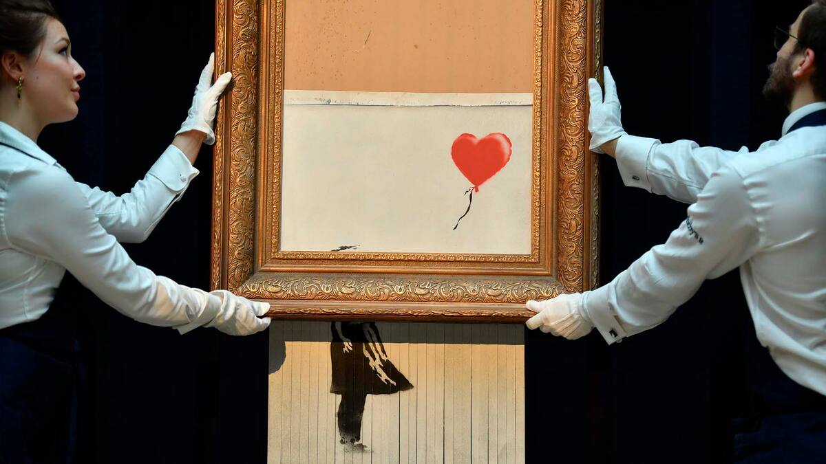 En un video publicado en redes sociales, Banksy explicó cómo había integrado un mecanismo en el espeso marco dorado que permitía rasgar la obra Girl with Balloon, una reproducción en acrílico y aerosol de una de sus pinturas más conocidas —una niña que deja volar un globo rojo con forma de corazón—.