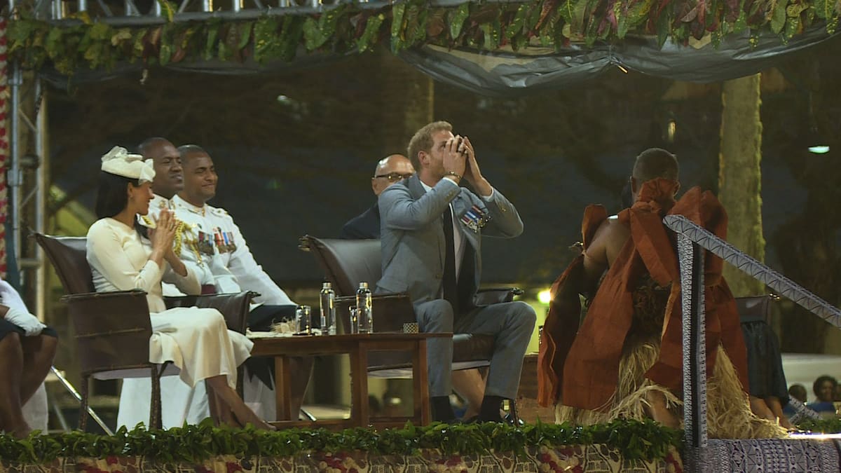 El príncipe Enrique, nieto de Isabel II, y su esposa, Meghan Markle, llegaron este martes a Fiyi, en el marco de su gira por Oceanía. El duque de Sussex probó el kava, una bebida local con propiedades sedantes.