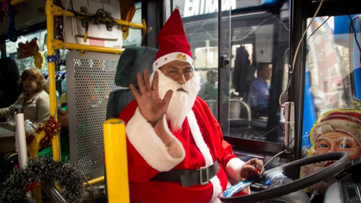Papá Noel cambió sus renos y su trineo para conducir un autobús en Ecuador, donde este viernes repartió caramelos a los usuarios del transporte público de Quito.