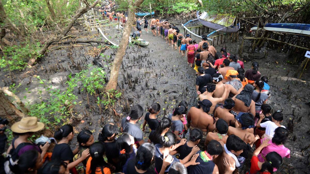 Vestidos con los tradicionales sarongs, hombres, mujeres y niños se embadurnan el cuerpo con el barro de los bosques de manglares del pueblo de Kedonganan, cerca de la ciudad de Denpasar.