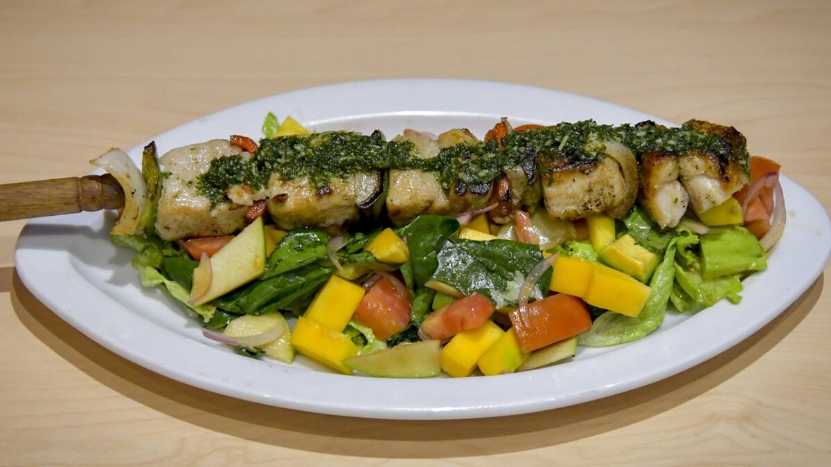 Brocheta de róbalo y pesto sobre una cama de ensalada primavera fue el plato elaborado por Norelbis Pertúz, líder de cocina del restaurante Cevichitos.