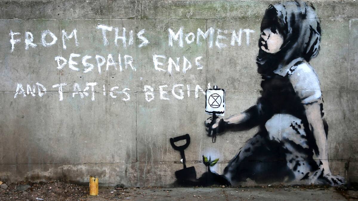 Es el dibujo de un niño en cuclillas que en la mano derecha sostiene el símbolo de Extinction Rebellion, junto a una pala y un montículo de tierra donde parece haber plantado un pequeño árbol.