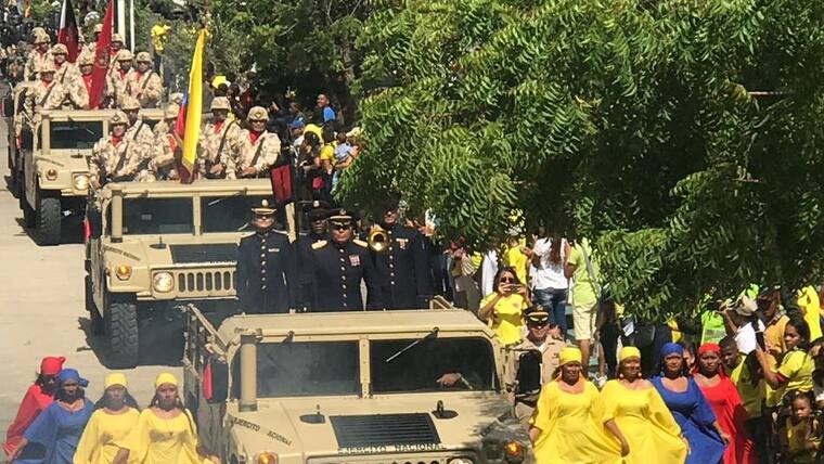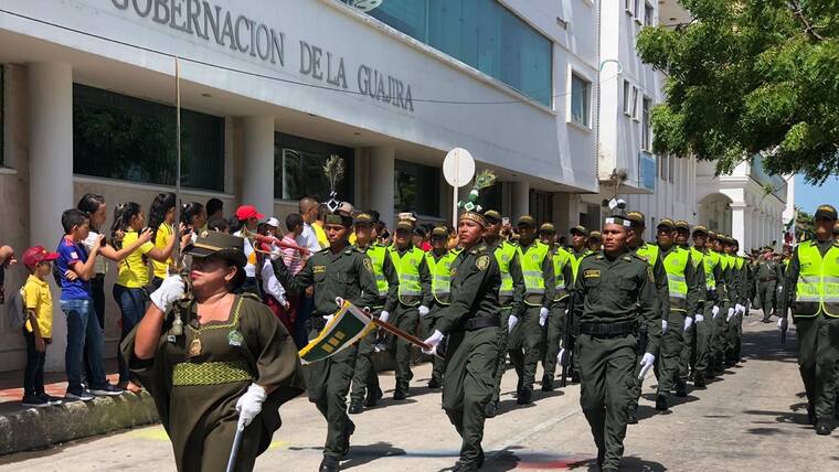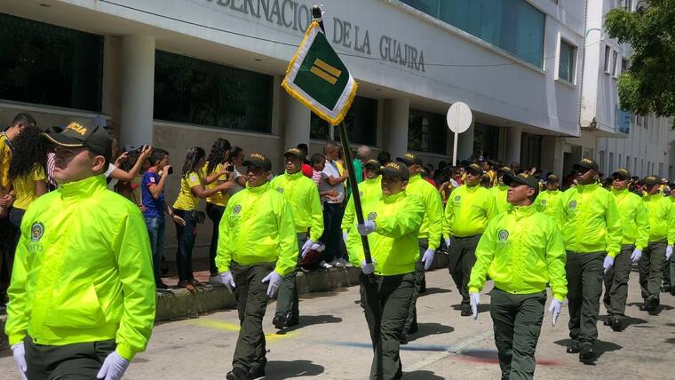 El desfile estuvo encabezado por el Ejército, seguido de la Armada y la Policía. Luego de ellos siguieron las delegaciones del CTI, Inpec, Migración, Gobernación departamental, Alcaldía del Distrito, Contraloría, Defensoría, Cámara de Comercio, la Diócesis, ICBF, Tránsito Distrital y Departamental, Corpoguajira, Confaguajira, Uniguajira, Damas Rosadas, la empresa Cerrejón e instituciones educativas, entre otros participantes.