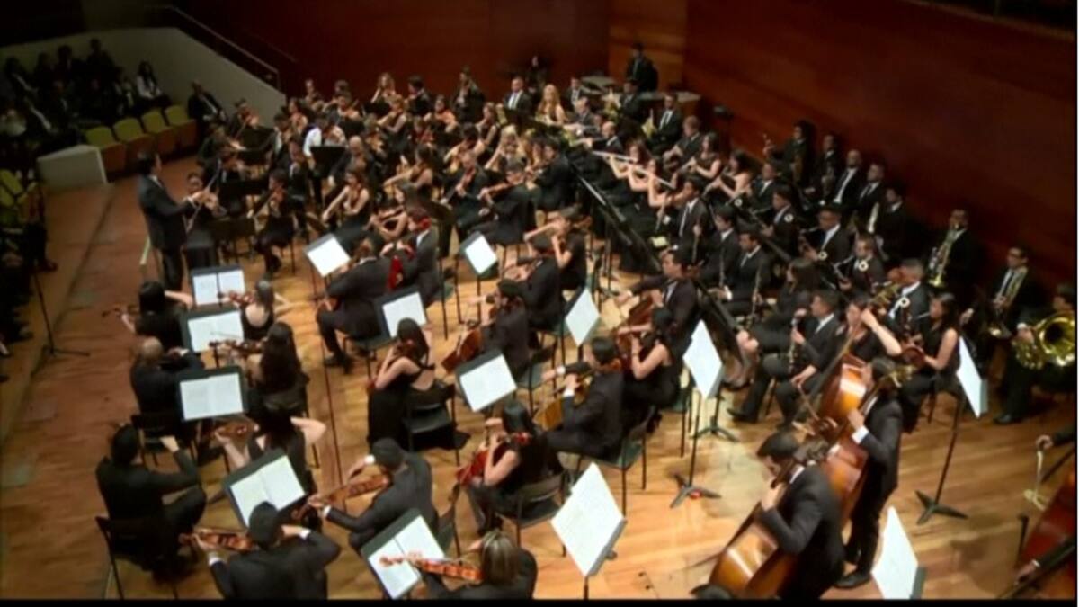 El centenar de concertistas afina con esmero los instrumentos: oboes, violines y percusiones, cuyos sonidos de a poco calientan la fría sala de ensayo en el noroeste de la capital colombiana.