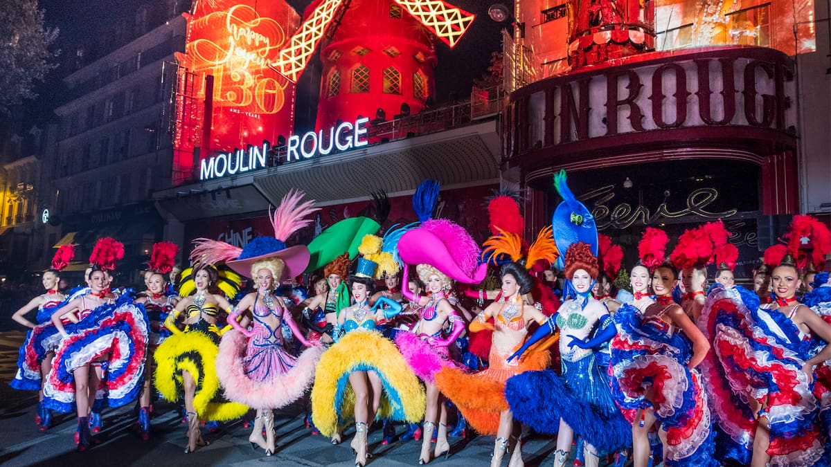 Miles de personas se congregaron el domingo por la noche en el bulevar frente al Moulin Rouge de París para asistir a un espectáculo de can-can y fuegos artificiales celebrando los 130 años del célebre cabaret de Montmartre.