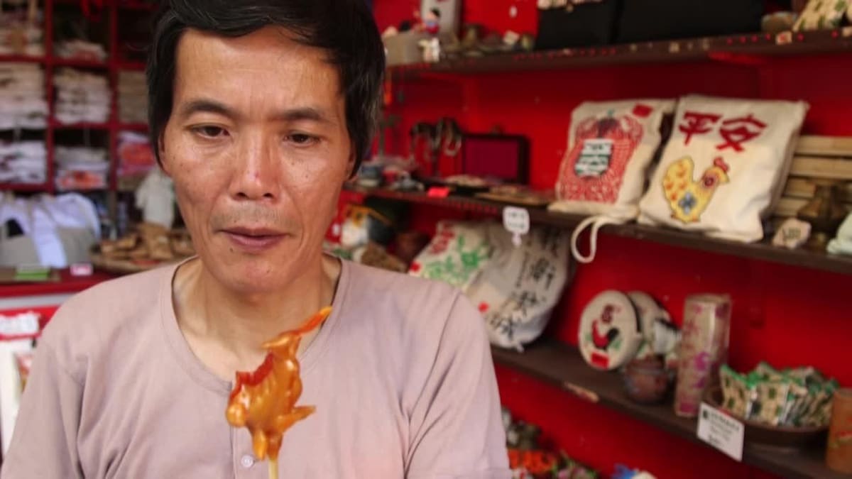 Con solo unas tijeras, tubos de vidrio soplado y pequeñas herramientas de metal, el hongkonés Louis To convierte trozos de azúcar fundido en caramelos con forma de dragones, peces o flores.