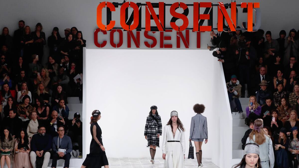 La palabra Consent (consentimiento) se proyectó durante todo el desfile, en un espacio al estilo de los años 1970. Entre el público figuraban innumerables famosos, como las actrices Demi Moore, Andy McDowell y Sigourney Weaver, la activista nicaragüense Bianca Jagger y las modelos Cara Delavingne y Karlie Kloss.