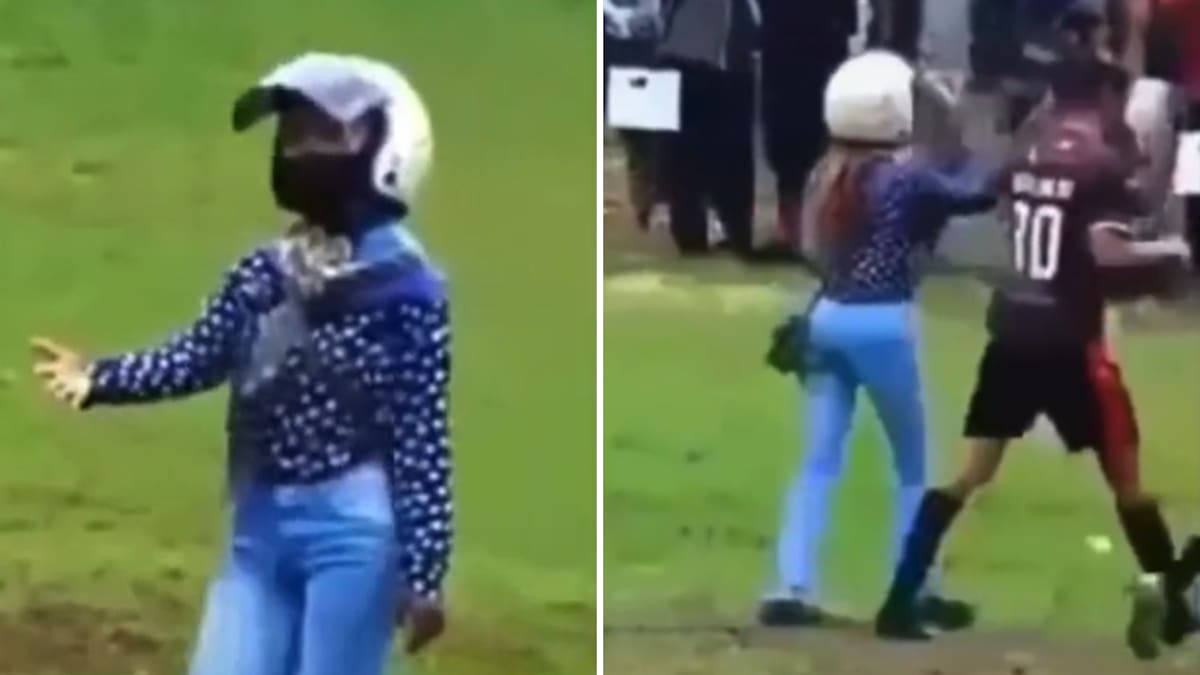 En las imágenes se ve a una mujer con un casco de motocicleta, entrar a la cacha con paso firme para dirigirse al que parecía ser su pareja sentimental.