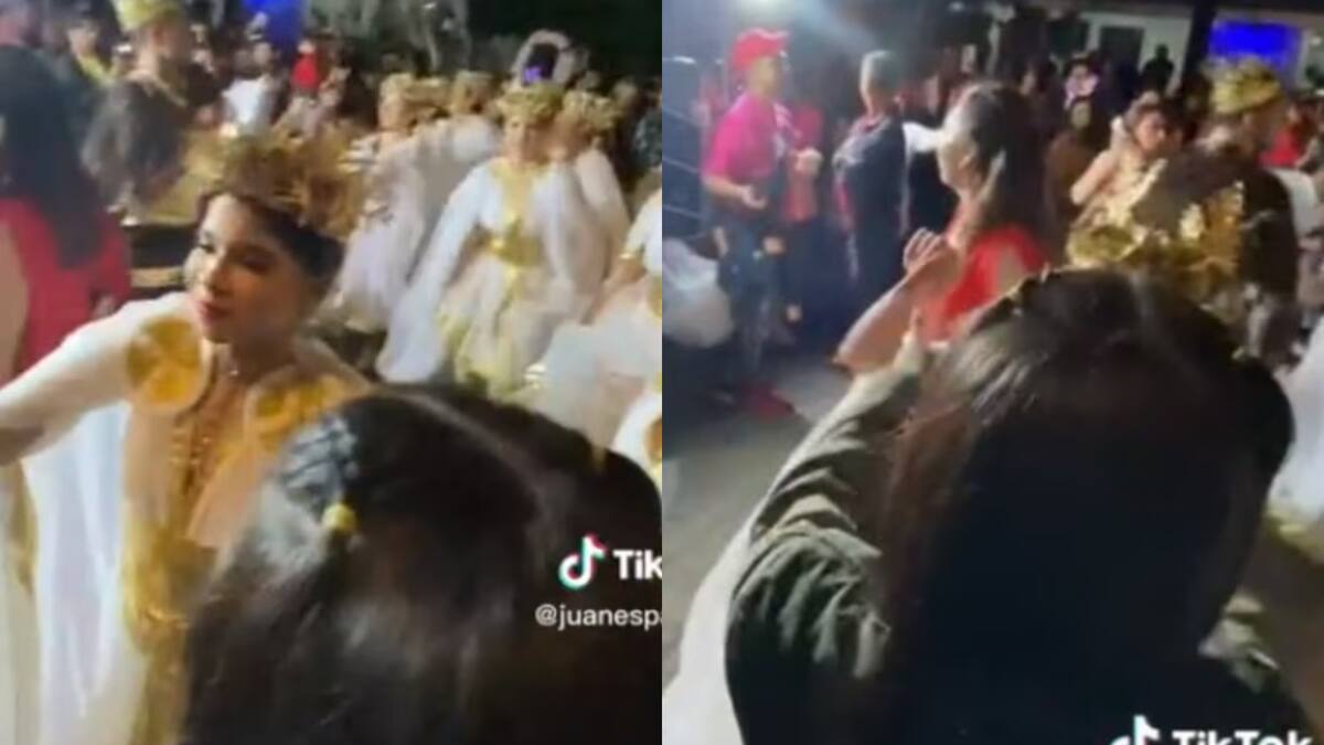 En la grabación se observa que una joven integrante de una comparsa intenta acercarse a Juan Esparza para animarlo a bailar en plena calle y la novia de este le lanza varios golpes.