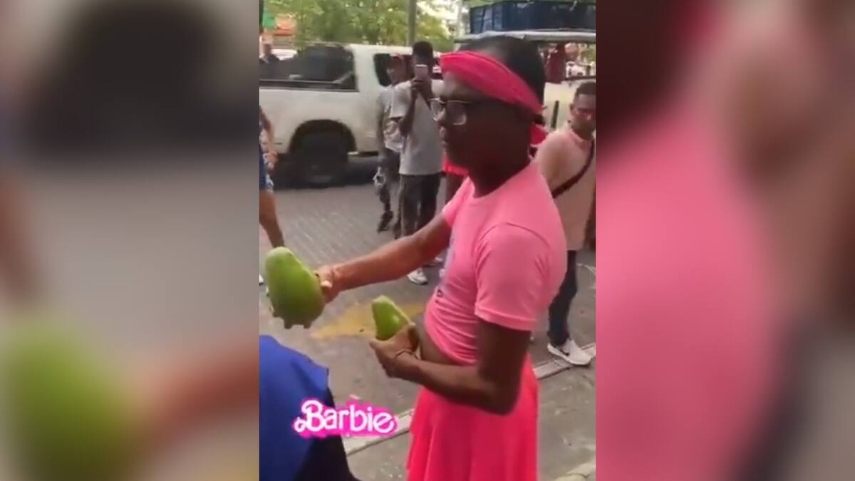En las imágenes, que se volvieron virales esta semana en redes sociales, se ve a los hombres vestidos como Barbie, con blusas rosadas, minifaldas y lazos en su cabeza del mismo color, mientras empujan la carretilla en la que llevan los aguacates que venden en el centro de Barranquilla.
