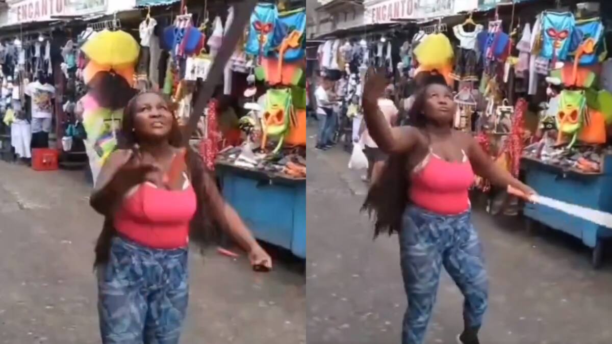 En la grabación se observa como la mujer con tres machetes en mano, los lanza al aire e iniciar a realizar malabares, ante la mirada atónita de los transeúntes; sin embargo, esto no es lo más peligroso, pues coloca la punta de una de las armas blanca en su boca, mientras choca los otros dos machetes.