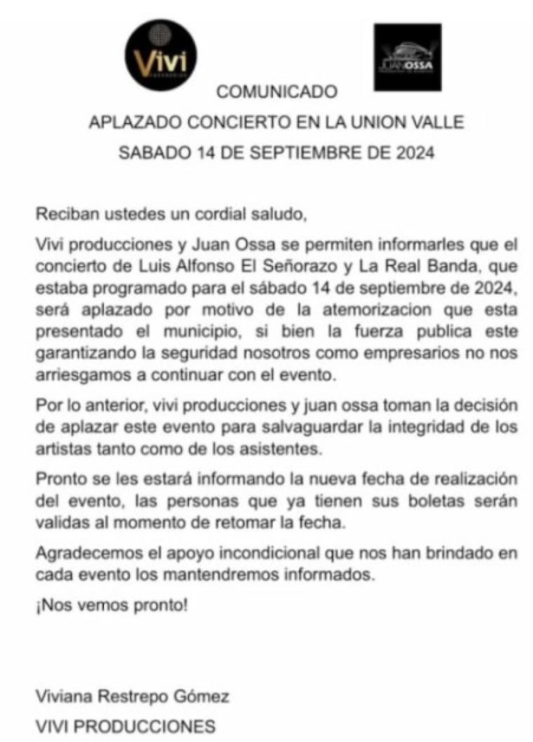 El concierto del cantante de música popular Luis Alfonso en La Unión, Valle, fue suspendido por temas de seguridad.