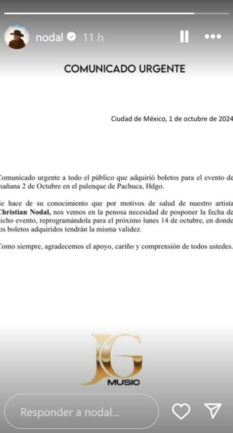 El evento fue reprogramado para 14 de octubre. “Se hace de su conocimiento que por motivos de salud de nuestro artista Christian Nodal nos vemos en la penosa necesidad de posponer la fecha de dicho evento, reprogramando para el próximo lunes 14 de octubre, en donde los boletos adquiridos tendrán la misma validez”.