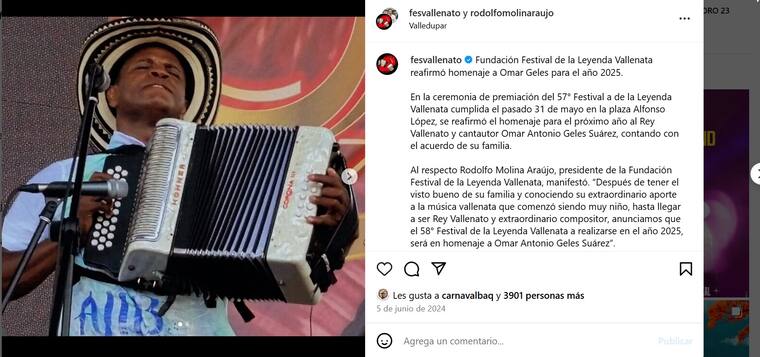 En esta ocasión le rendirán homenaje al fallecido compositor y acordeonero Omar Antonio Geles Suárez, quien falleció el año pasado y dejó un gran legado.