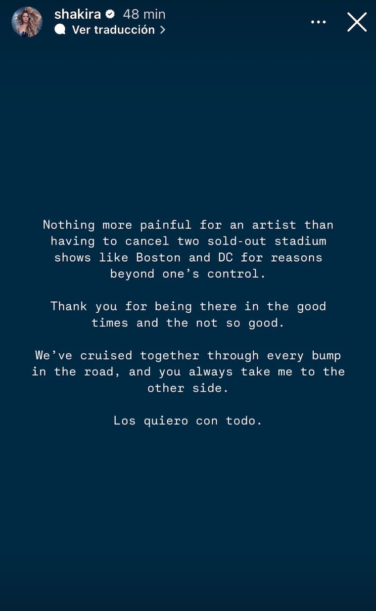 “Nada es más doloroso para un artista que cancelar conciertos con entradas agotadas, como los de Boston y Washington, por causas fuera de nuestro control. Gracias por estar siempre ahí. Hemos sorteado muchos obstáculos juntos y ustedes siempre me han ayudado a seguir adelante. Los quiero con todo mi corazón”, dijo la barranquillera.