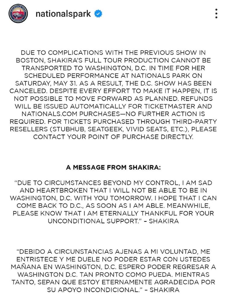 A través de un comunicado, los organizadores del evento en Washington informaron: “Debido a complicaciones con el concierto anterior en Boston, la producción completa de la gira de Shakira no pudo ser transportada a Washington, D. C. a tiempo. A pesar de todos los esfuerzos para que se realizara, no fue posible continuar con el plan establecido.”