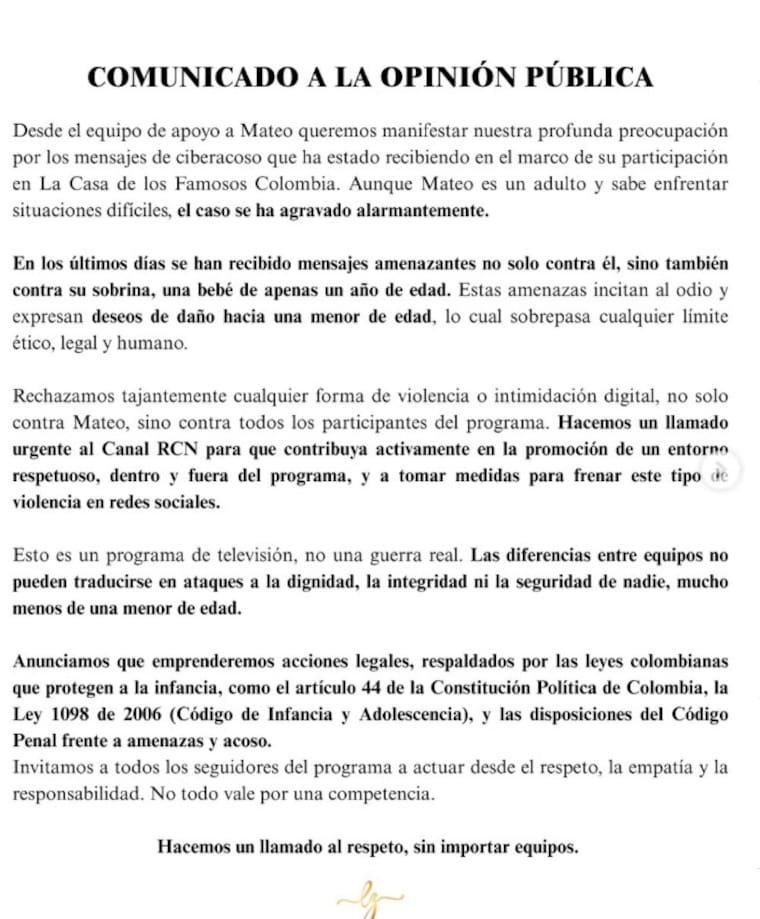 “Queremos manifestar nuestra profunda preocupación por los mensajes de ciberacoso que ha estado recibiendo en el marco de su partición en La casa de los famosos Colombia. Aunque Mateo es un adulto y sabe enfrentar situaciones difíciles, el caso se ha agravado alarmantemente”, dijeron.