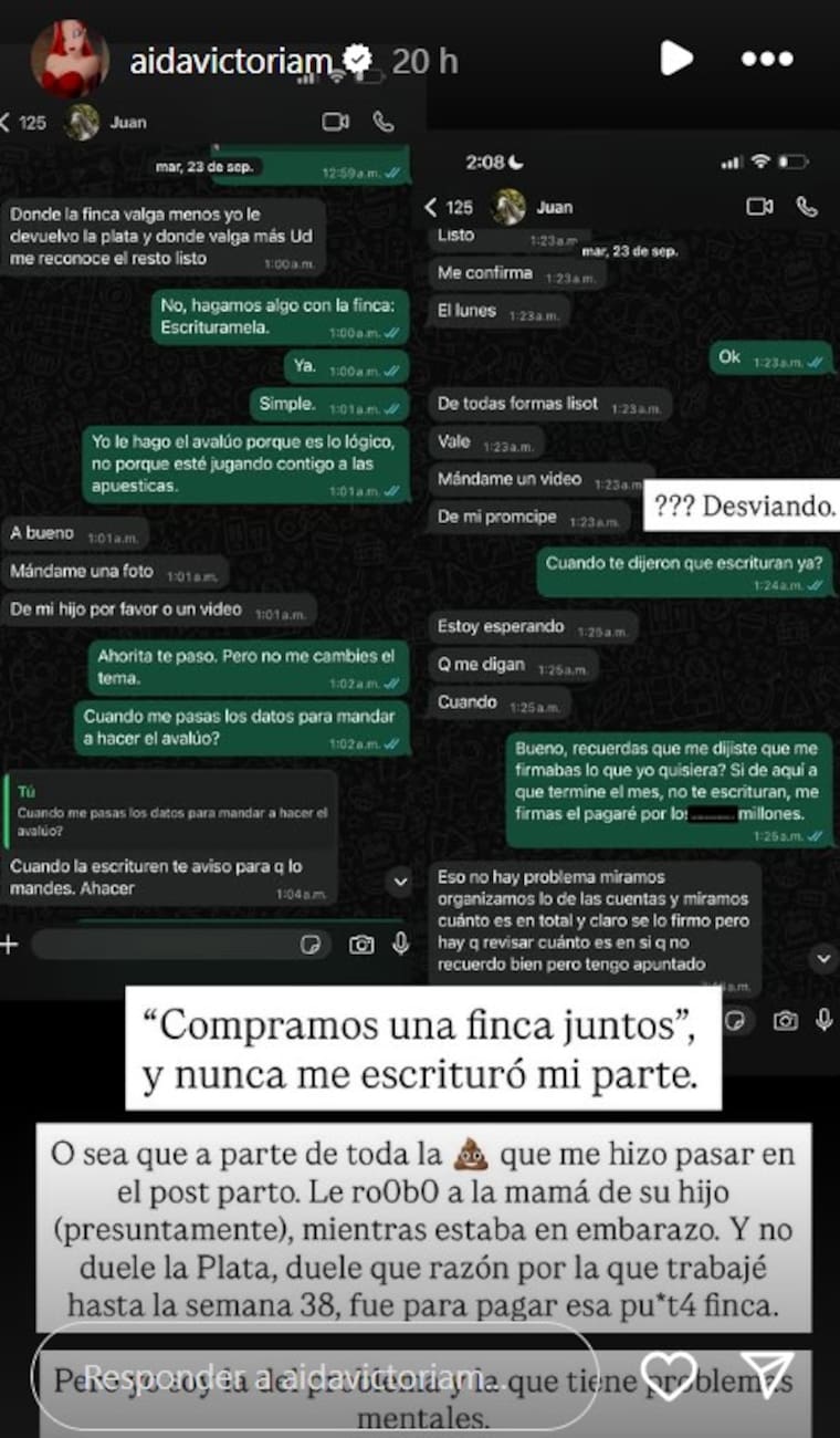 En sus historias de Instagram, Merlano compartió capturas de chat en las que se aprecia cuando ambos conversaban sobre una finca que, según ella, compraron juntos.