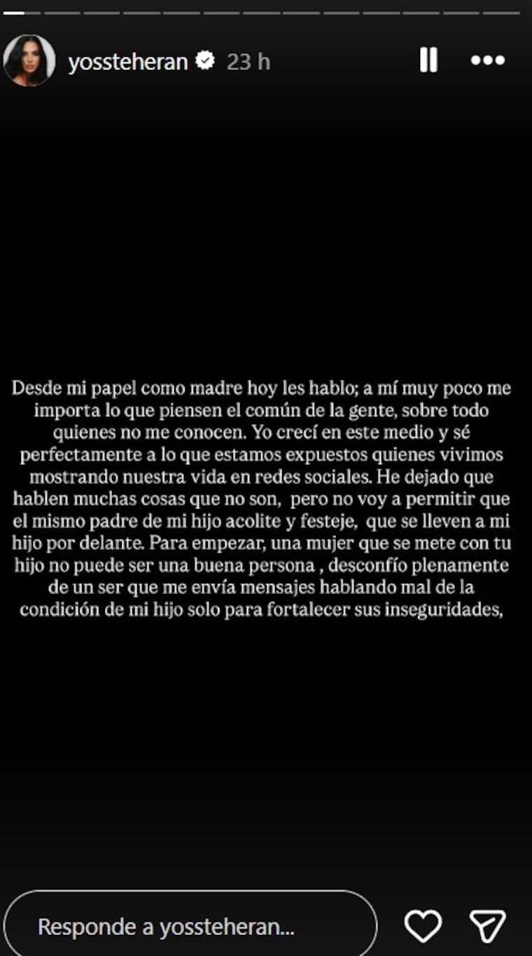 “Desde mi papel como madre hoy les hablo: a mí muy poco me importa lo que piense el común de la gente, sobre todo quienes no me conocen. Yo crecí en este medio y sé perfectamente a lo que estamos expuestos quienes vivimos mostrando nuestra vida en redes sociales. He dejado que hablen muchas cosas que no son, pero no voy a permitir que el mismo padre de mi hijo acolite y festeje que se lleven a mi hijo por delante”, escribió.