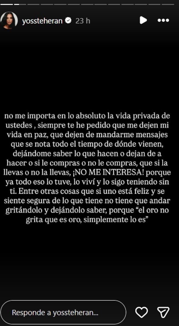 “Te recuerdo que fui yo quien no quiso estar más contigo. Tú, Julio Teherán, en minúscula, porque así te ves ahora y así estás quedando. No eres un buen padre. Te has mostrado ante la gente como el ‘pobre’ de esta situación que tú mismo dañaste hace más de tres años, cuando recibí por mensaje privado un video íntimo tuyo con otra mujer siéndome infiel”, indicó.