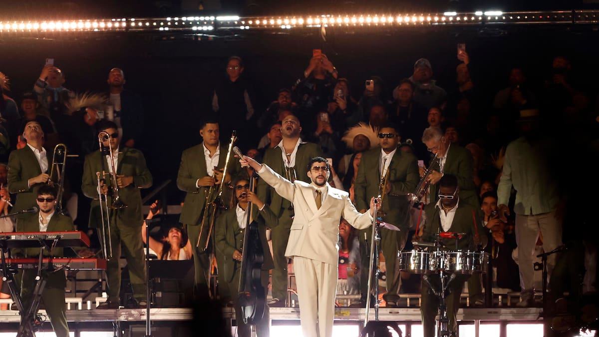 Bad Bunny inició el concierto con un traje beige, corbata dorada y una gafas tipo aviador de montura ancha, luego se cambió por un look más ligero y aprovechó hasta el techo de su ‘Casita’ para poner a bailar a los más de 60.000 asistentes que se dieron cita en su primera fecha en la capital mexicana.