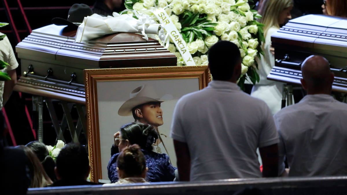 En la primera línea, alineados frente al público y al escenario estaban los féretros con la foto de Jiménez y de las otras cinco personas que murieron en el accidente, cubiertos de arreglos florales y custodiados por familiares, allegados y personal de logística.