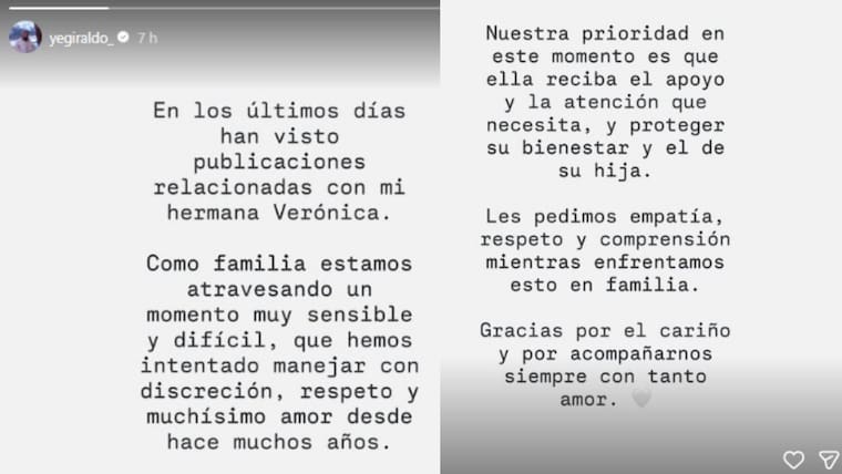 Las publicaciones, que se hicieron virales, generaron polémica en redes sociales y gran especulación sobre el caso, por lo que Jessica Giraldo, hermana de Karol G y manáger de la cantante, tuvo que pronunciarse y reconocer que efectivamente la familia está atravesando un momento “muy sensible y difícil” y pidió empatía.