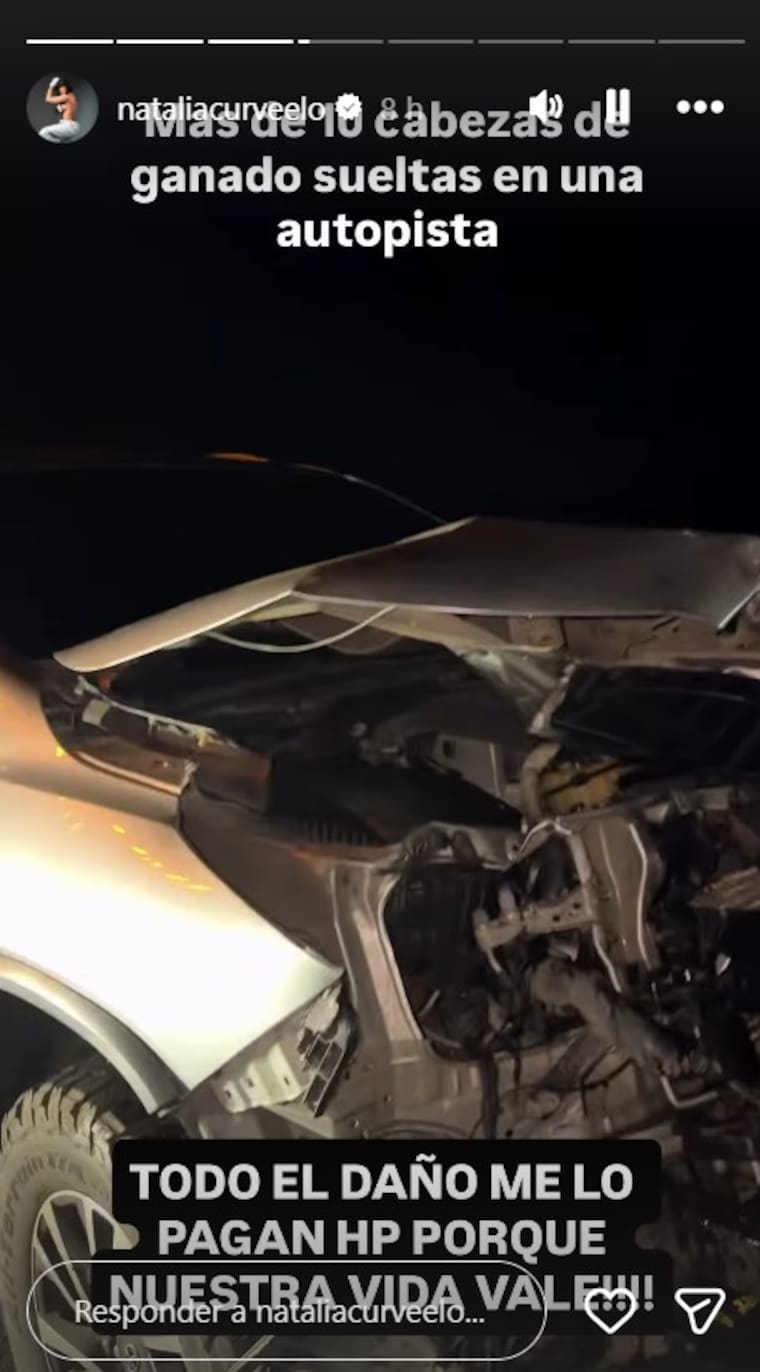 De acuerdo con el relato de la propia artista, una vaca apareció de manera repentina en el corredor vial, lo que hizo imposible evitar el impacto. La camioneta Toyota en la que viajaban terminó con severas afectaciones en su parte frontal.
