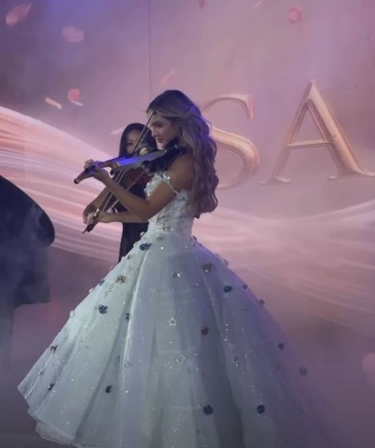 Mediante la cuenta de Andrea se pudo evidenciar cada detalle del evento. La quinceañera apareció con un diseño azul celeste de la marca D Maria Store, adornado con bordados dorados y detalles en azul rey en el corset que se extendían hacia la falda.