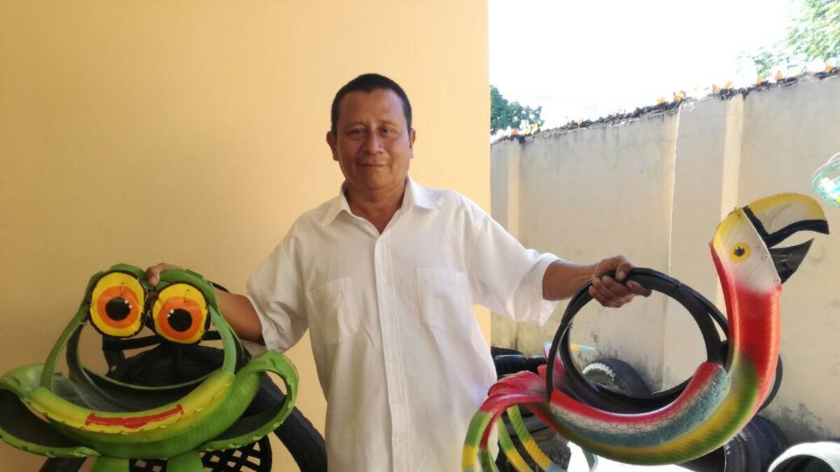 'Por el tema de la contaminación a escala del mundo lo mejor es buscarle un beneficio o una utilidad a las llantas, lo bueno también es que esta destreza que Dios me regaló puedan desarrollarla otras personas', recalca Martínez.
