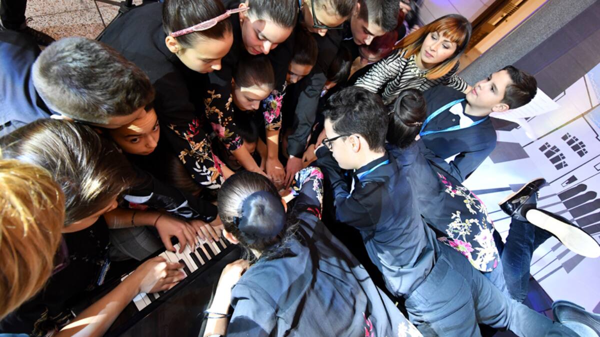 18 niños y adolescentes bosnios, junto a dos profesores, buscan batir un récord Guinness, el de más personas tocando un piano a la misma vez.