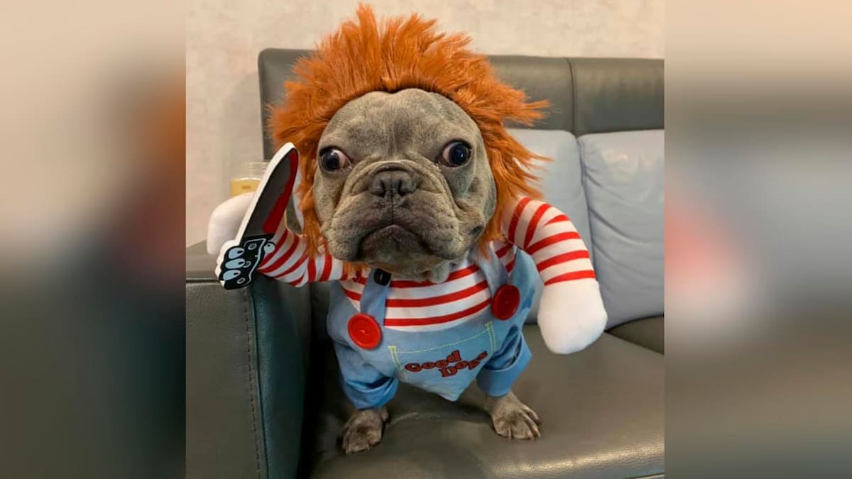 Un perro llamado Romeo fue grabado por su dueña, Vanessa Cheng, disfrazado de Chucky, ‘el muñeco maldito’. El perrito lleva puesto el pullover a rayas del personaje de terror, cabello naranja y el icónico cuchillo ensangrentado. El video, compartido en Facebook, ya tiene más de 15 millones de reproducciones.