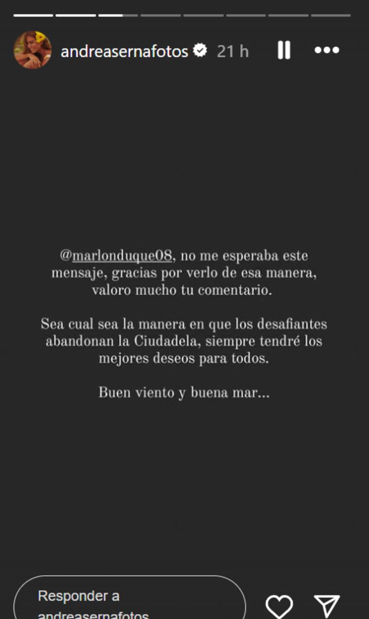 “Marlon no me esperaba este mensaje, gracias por verlo de esta manera, valoro mucho tu comentario”, escribió y más adelante explicó que independientemente de la forma en la que los desafiantes se van de la competencia, ella siempre desea lo mejor para todos. Finalmente volvió a hablar del deportista y le deseó “buen viento y buena mar”, le escribió al atleta.