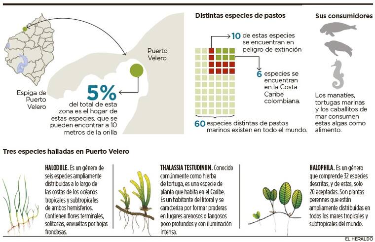 El biólogo marino Sven Zea, profesor de la Universidad Nacional de Colombia, sede Caribe, manifiesta que le sorprende y le parece 'interesante' que estos pastos marinos crezcan en el Departamento, ya que en su mayoría son estudiados en las bahías de Santa Marta y Cartagena. 'El Atlántico tiene una particularidad con el mar, y es que su mar es abierto, no hay muchas ensenadas, y precisamente esta vegetación crece en bahías en donde no llega el fuerte oleaje', explicó. También agregó que la barrera de arena que tiene Puerto Velero hace que esta playa sea un espacio apropiado para que crezcan estos pastos marinos.