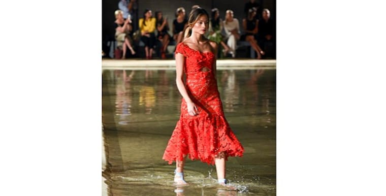 Sandalias planas con cintas de raso permitieron que modelos, con faldas y vestidos por debajo de la rodilla, caminaran entre el agua, creando una interacción entre el ambiente y los diseños. La música hacía juego con el curso relajado y tranquilo de la pasarela.