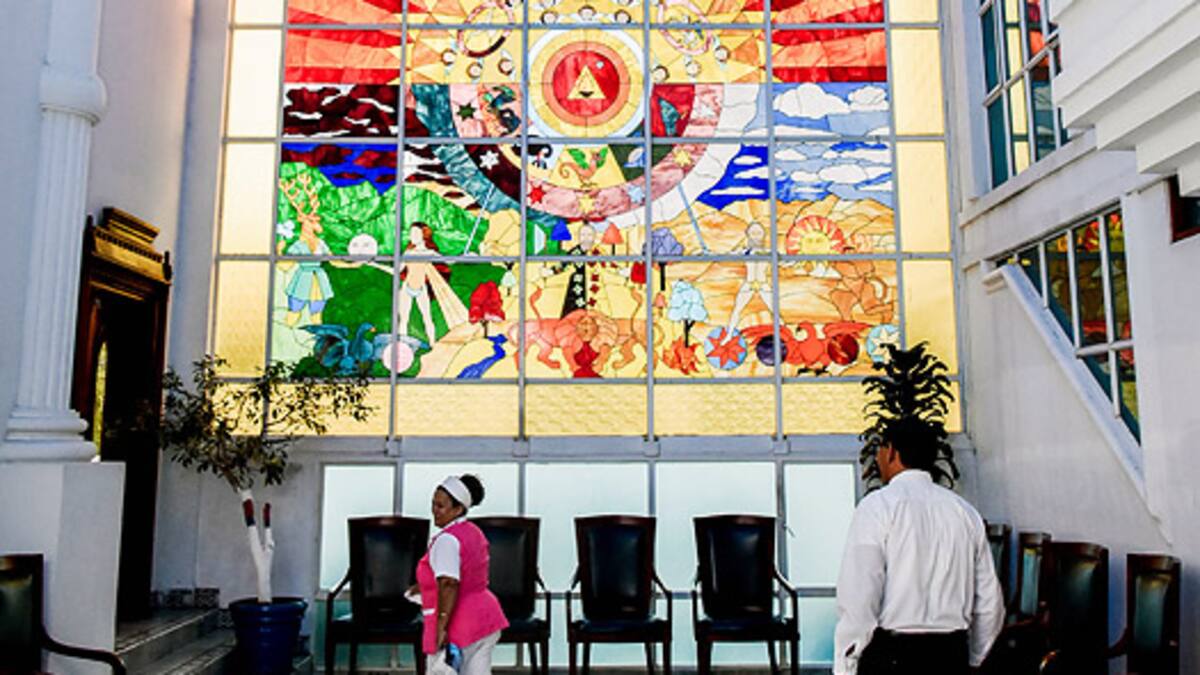 El vitral, con sus imágenes de leones, siete estrellas, caras de ángeles, nubes, montañas, aves, cuerpos y colores cálidos, es el árbol de la vida, precisa Manuel Torres, y enmarca la decoración del primer salón del edificio, donde se celebran eventos sociales.