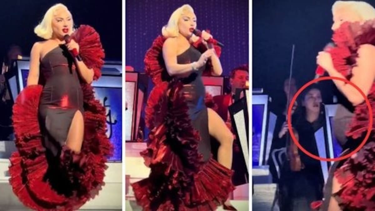 Videos que circulan en redes sociales muestran a Lady Gaga caminar despreocupada por el escenario luciendo un entallado vestido en tono rojo brillante que forma un bulto considerable en la parte del abdomen; la cantante se siente a tocar el piano mientras sus seguidores la graban con el celular.