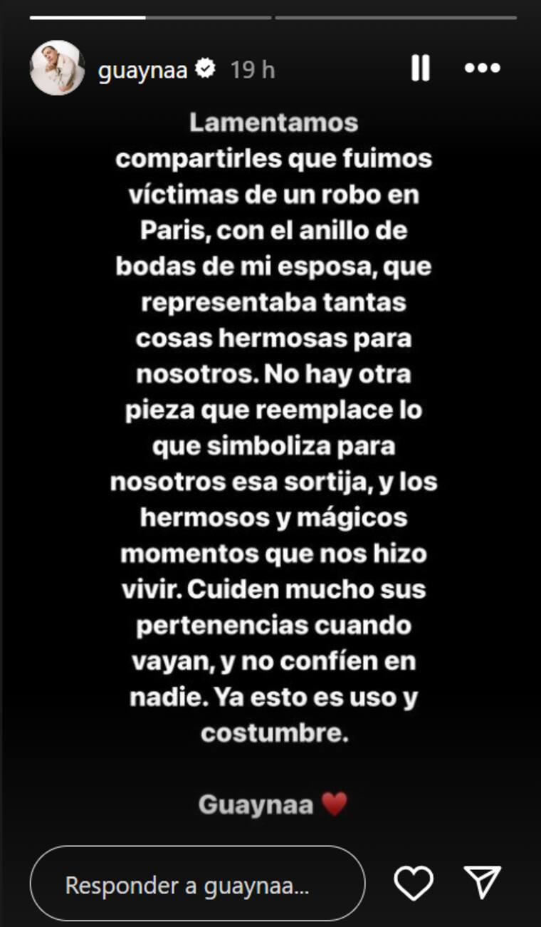 “No hay pieza que reemplace lo que simboliza para nosotros esa sortija y los hermosos momentos que nos hizo vivir. Cuiden muchos sus pertenencias cuando vayan y no se confíen de nadie. Ya esto es uso y costumbre”, señalaron.