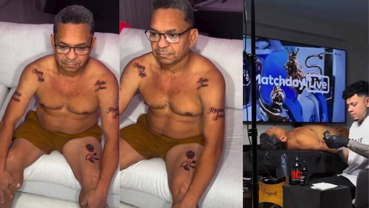 En su brazo derecho tiene el nombre de sus dos nietas, en su brazo izquierdo se tatuó el nombre de sus padres, en sus hombros escribió el nombre de sus cuatro hijos y en su pierna izquierda fue el turno de su esposa, nombre que adornó con una rosa.